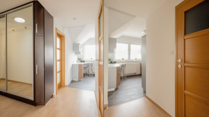 – Przedpokój – Duża szafa na wymiar + świetlik dachowy zapewniający naturalne doświetlenie.