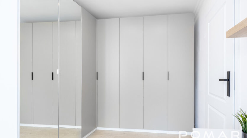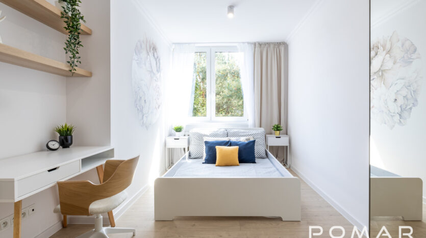 – sypialnia z dużą szafą, łóżkiem, stolikami nocnymi oraz biurkiem/toaletką
