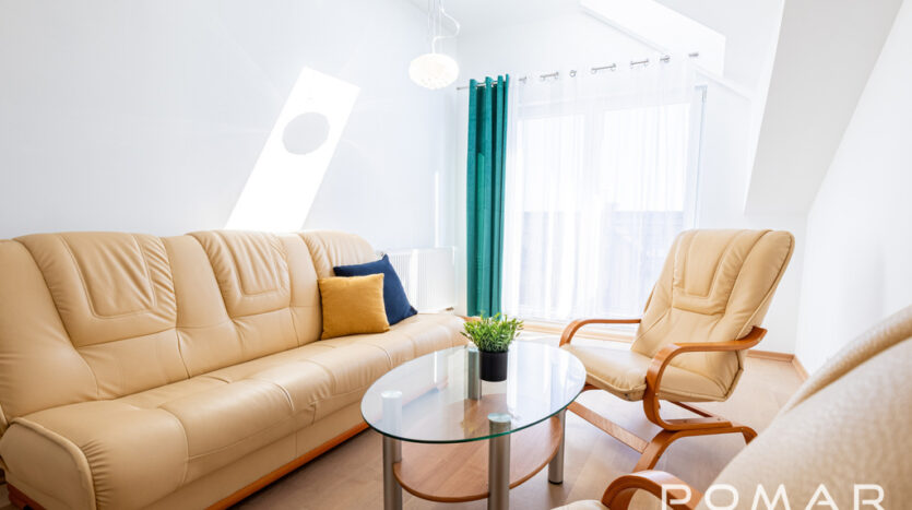 - Salon: jasny i ustawny, wyposażony w komplet wypoczynkowy. Posiada wyjście na balkon.