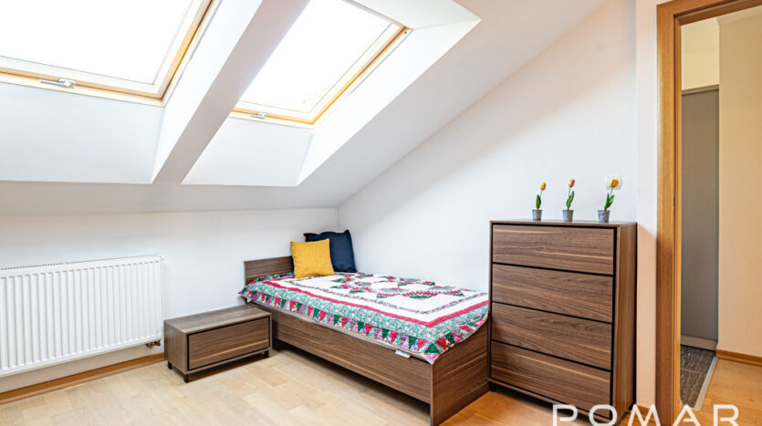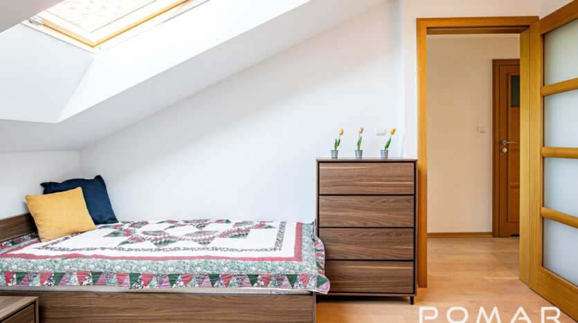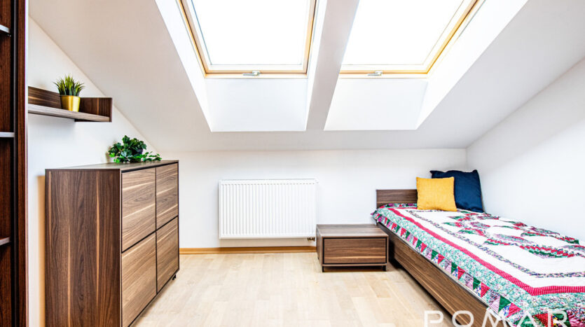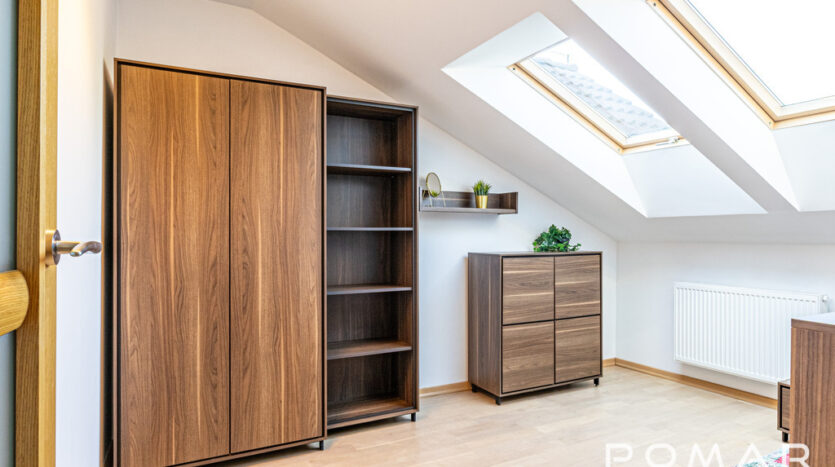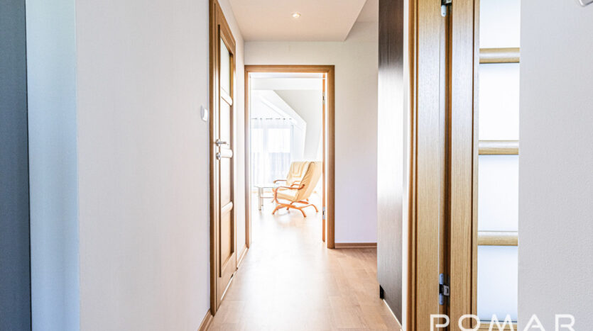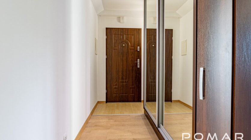 - Przedpokój: bardzo duża szafa na wymiar zapewnia ogromną ilość miejsca do przechowywania. W tej części znajduje się także świetlik dachowy, który wpuszcza naturalne światło – rzadko spotykane, a niezwykle praktyczne rozwiązanie.