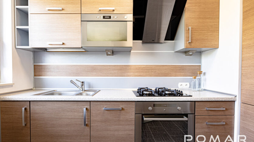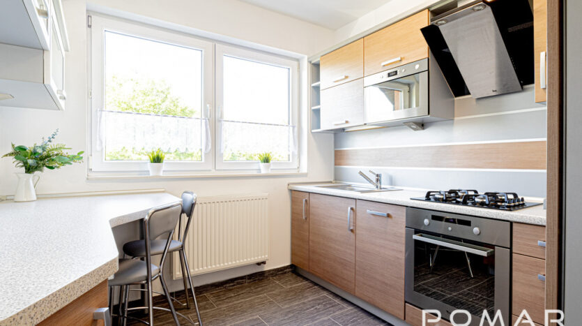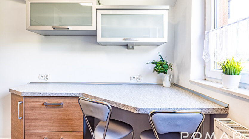 - Kuchnia: w pełni wyposażona w zabudowę kuchenną oraz sprzęty AGD, w tym zmywarka i mikrofalówka w zabudowie. Znajduje się tu również miejsce do wygodnego spożywania posiłków dla dwóch osób. Podłoga wyłożona płytkami.